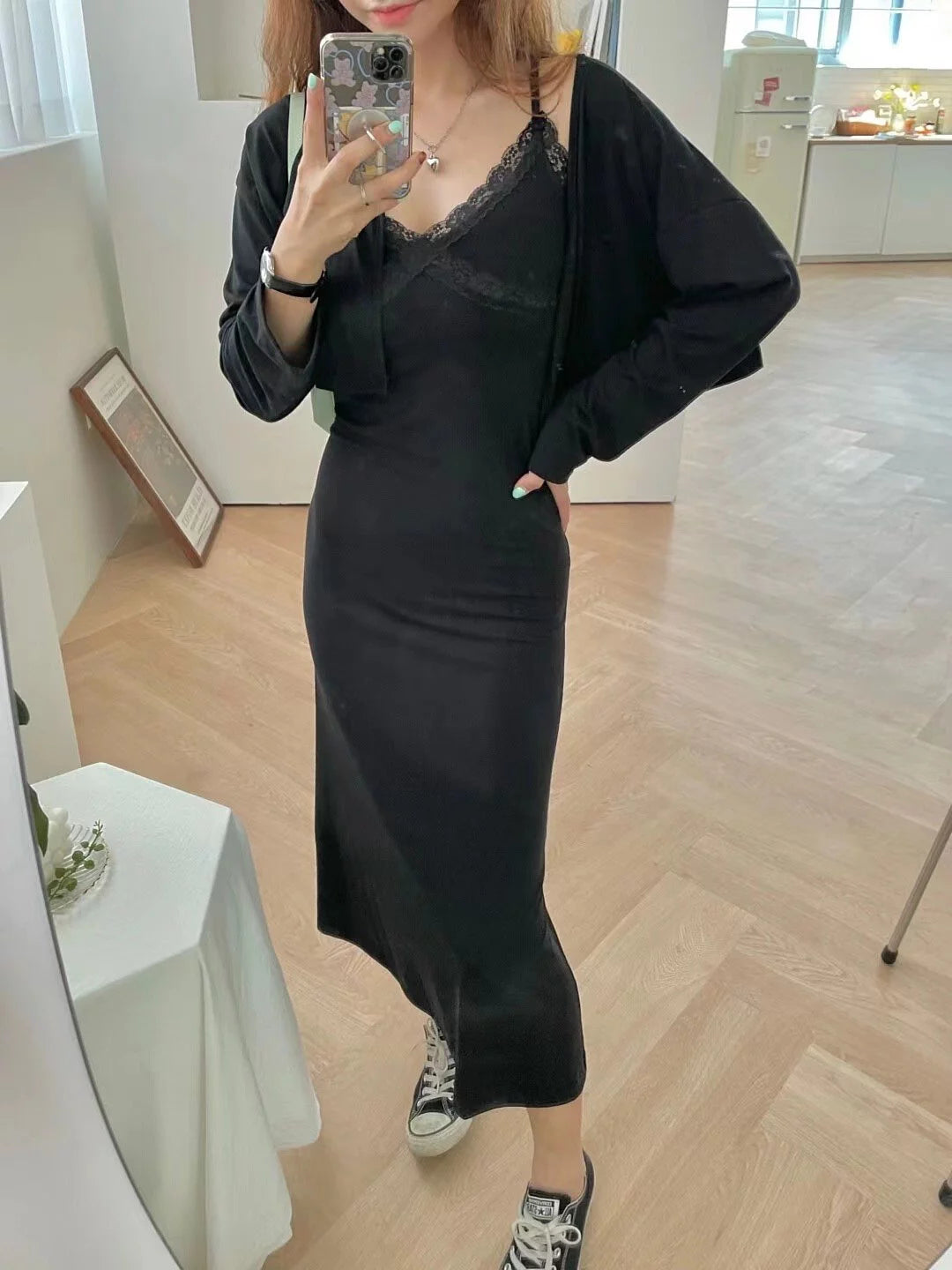 Lace trim dress with outer