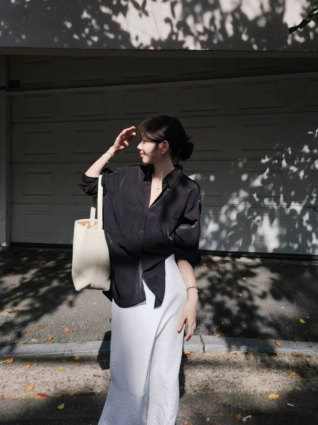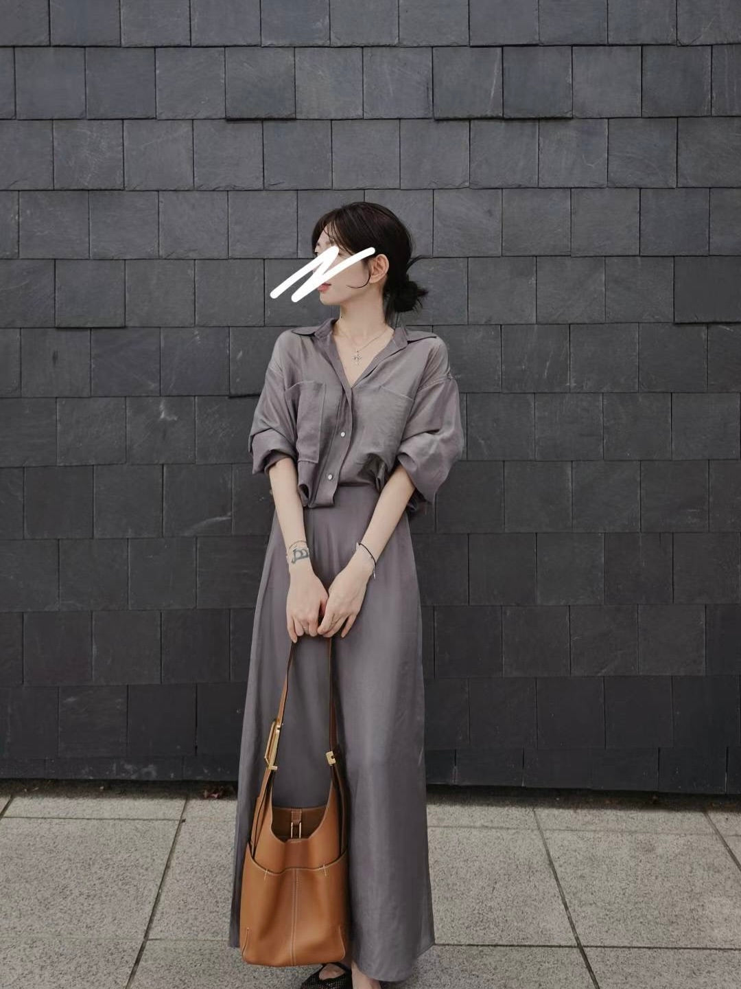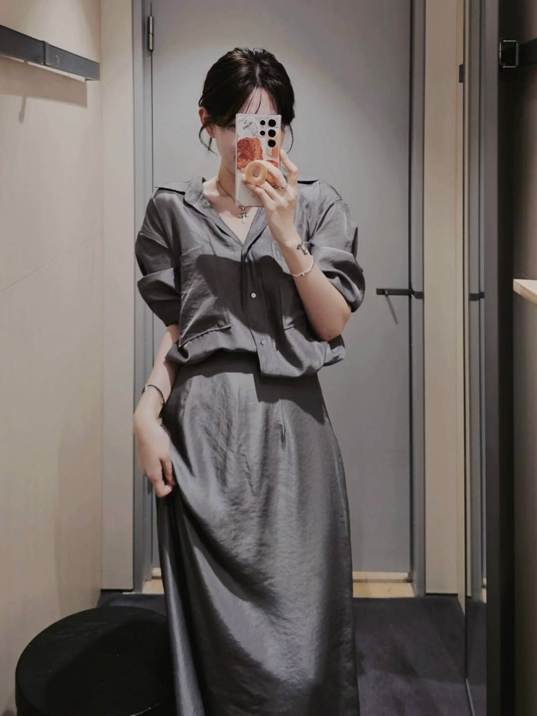 爆款的缎面长裙出同布料衬衫了,废土系高级时髦色调🍂🍂,慵懒/气质/飒美/休闲日常,大口袋设计,分开或是成套穿都好看😎😍