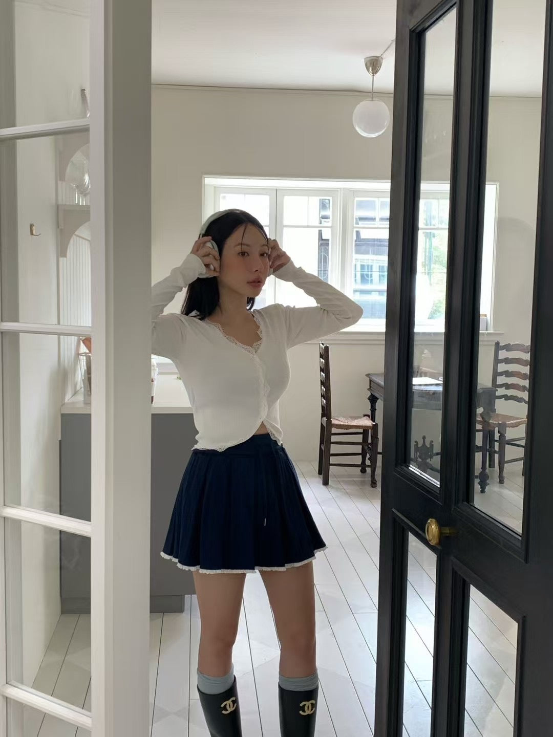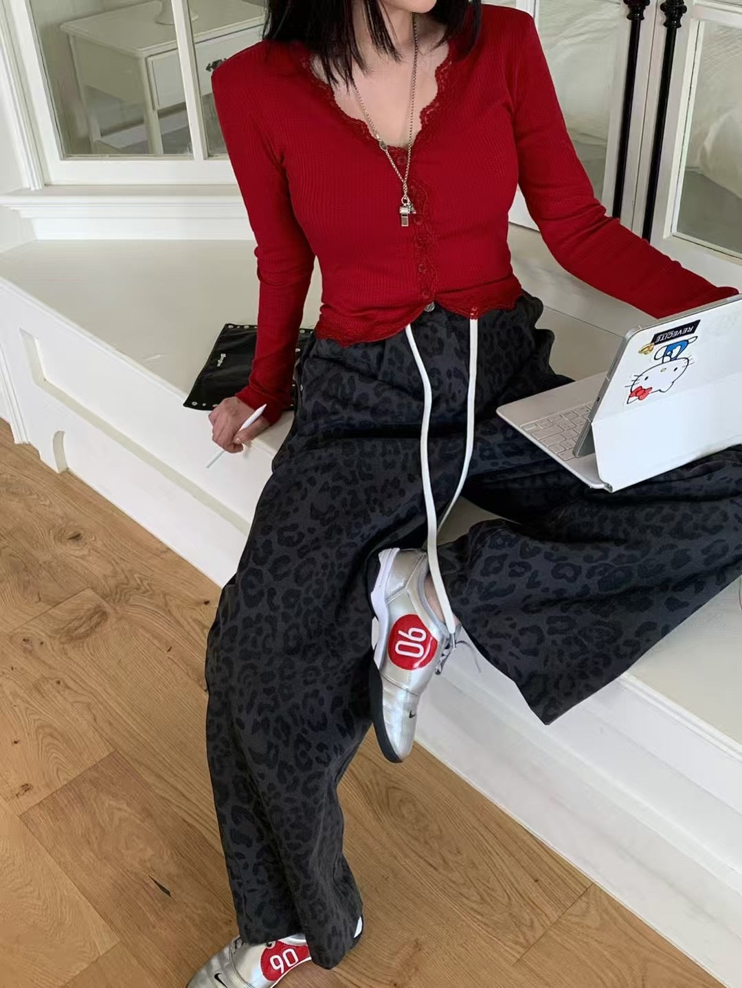 MS50912 V领蕾丝修身长袖上衣