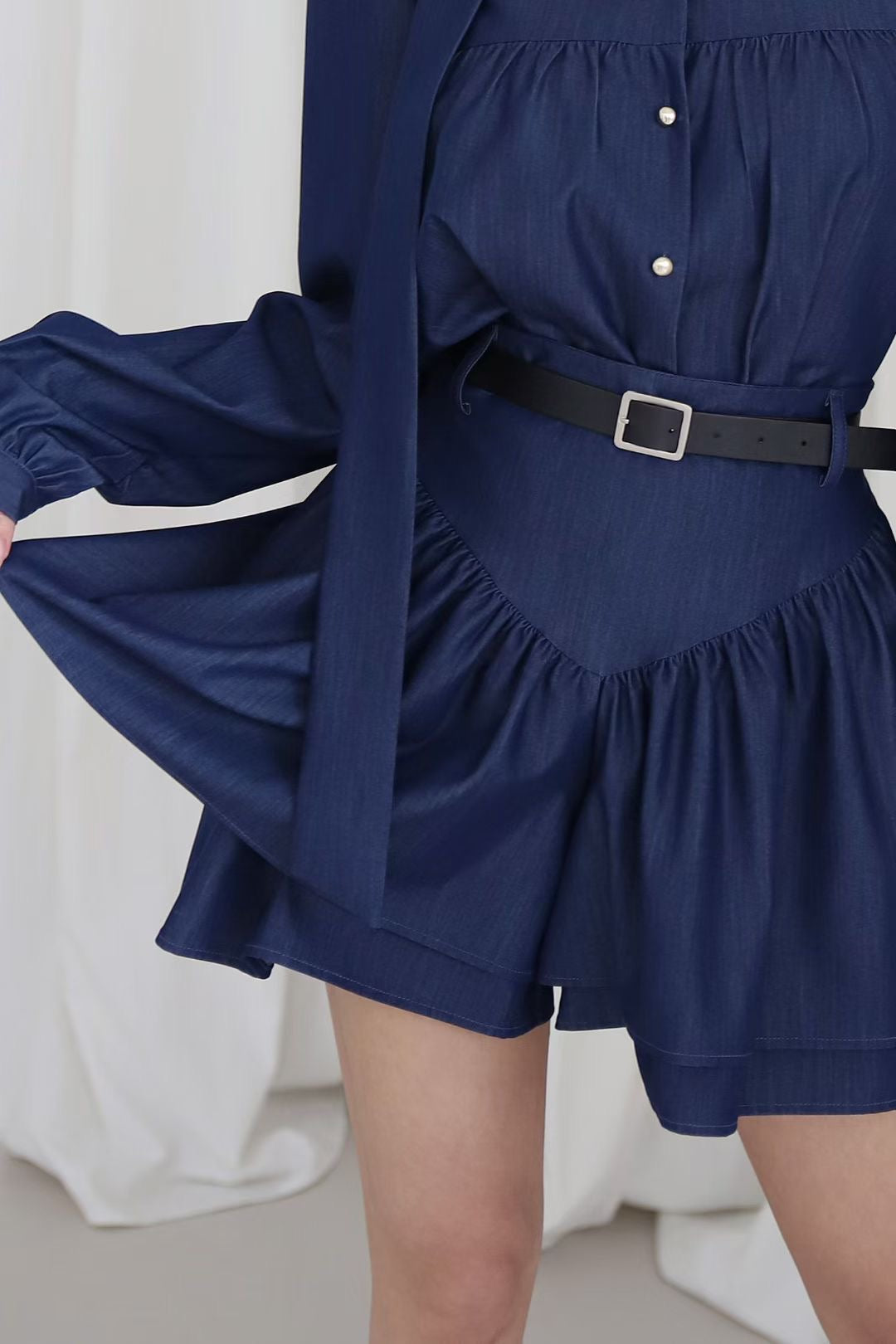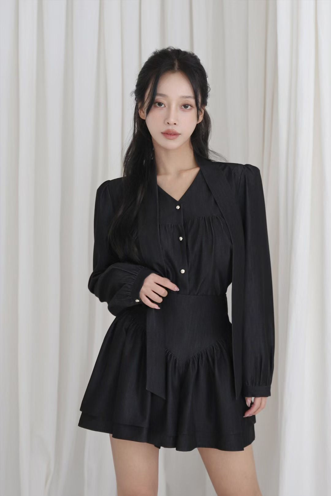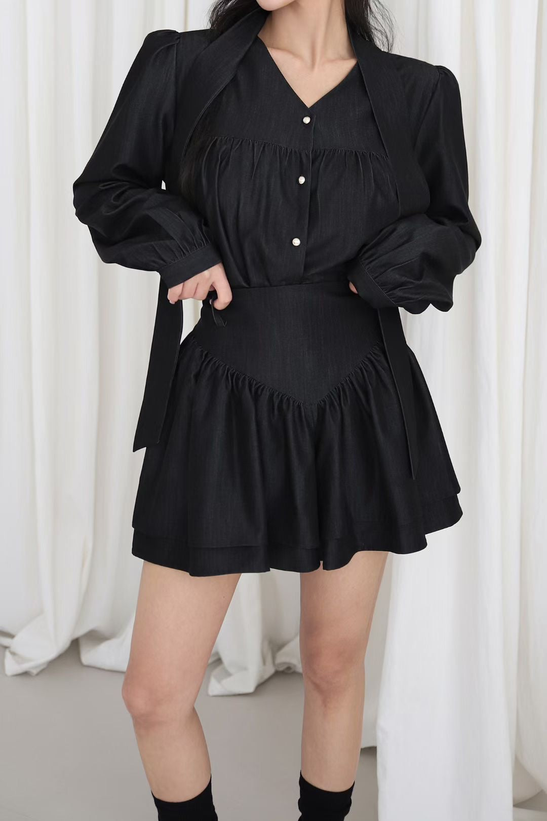 上衣长袖和高腰裙裤组合的套装