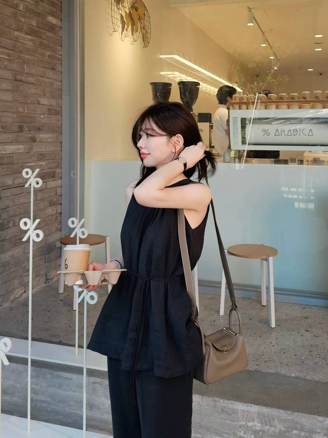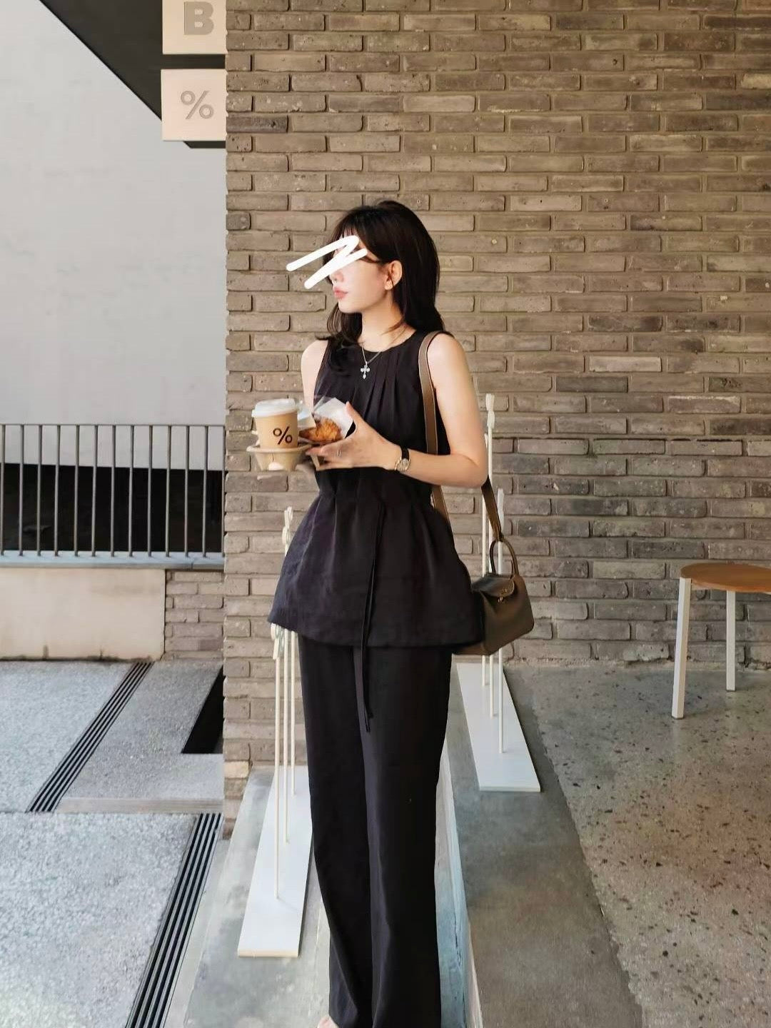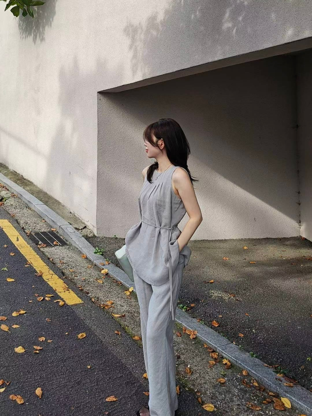 上身是A字剪裁,胸前的打折很漂亮,裤子是比较细身的小直筒,俐落干净的线条~