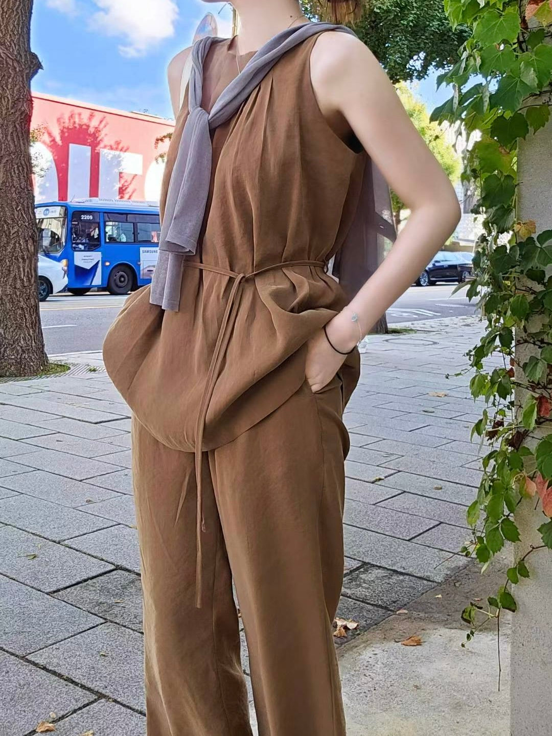 无袖上衣三色都有內里,附腰间绑带,长裤三色都有半內里,松紧腰,两侧隐形口袋~