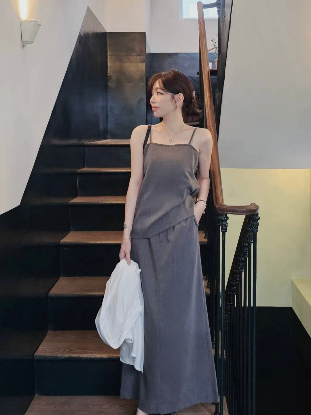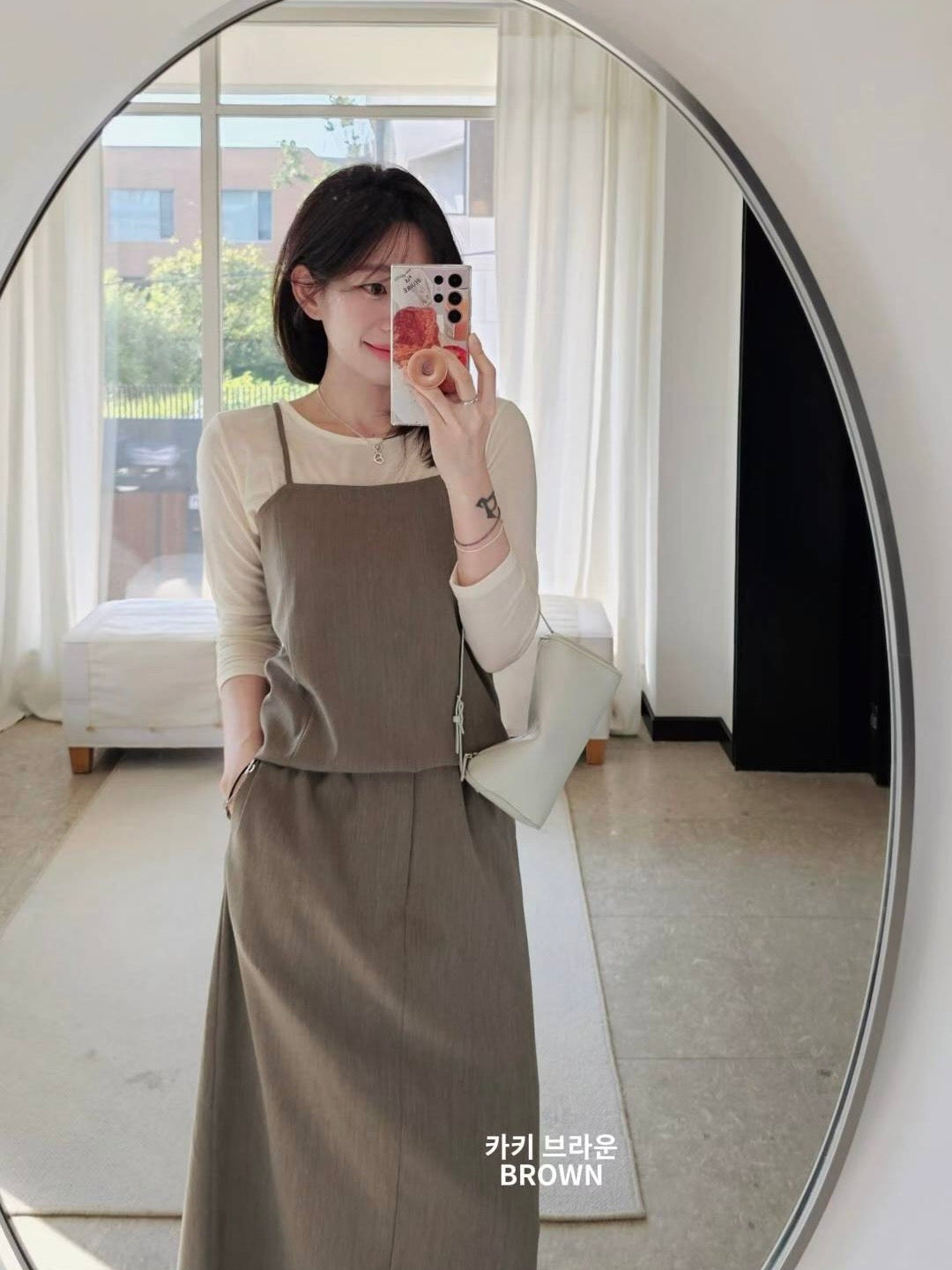 时髦的高质感套装,可以单穿或是在里面搭配打底T,外罩西装或是风衣外套直接时髦!!西装长裙是本季必备的时髦单品,另外搭配毛衣罩衫等等也都很好看🫶😎