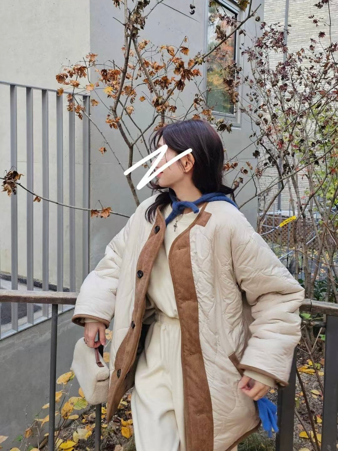 虽然不含羊毛,但是保暖度完全赞赞的~!!目前首尔的晚间约2-3°左右,欧尼里面单穿一件薄开衫就完全感觉不到外面的冷空气~太期待下雪时候穿去拍照了☃️📸高质感仿羊羔毛,触感柔软蓬松,超级亲肤,另一面是超细尼龙面料,细致雾面,完全没有塑胶感~,细节拼接柔软仿麂皮面料,腋下也有拼接麂皮,让袖拢不会臃肿,方便活动。 整件超轻只有1005g 😎